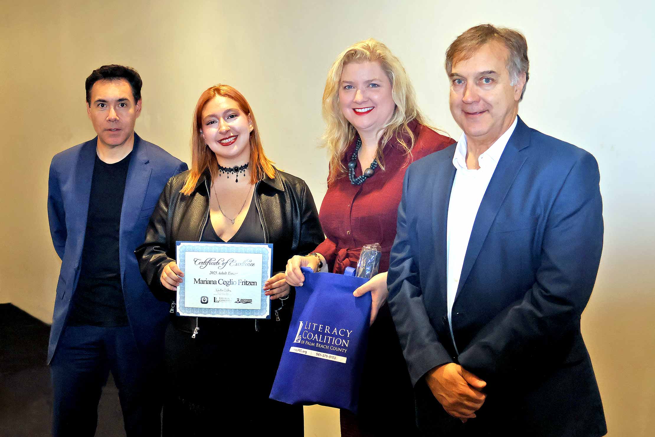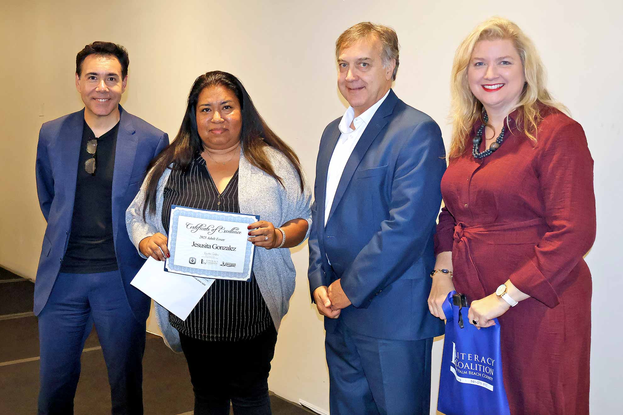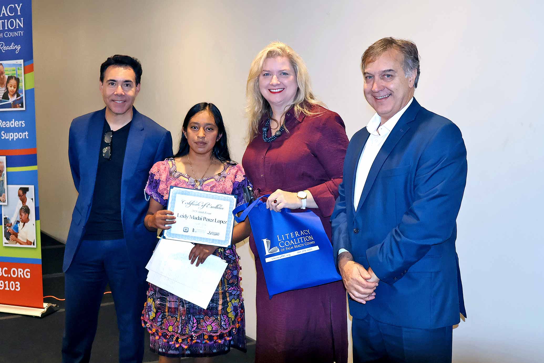 Adult Learner Asya Romero, Palm Beach Central Community High School. Shown with Carlos Mahecha, CBS 12 Sinclair Broadcasting Group, Literacy Coalition CEO Kristin Calder, and Fred Barch, Director School District of PBC, Department of Adult Education and Community Education.