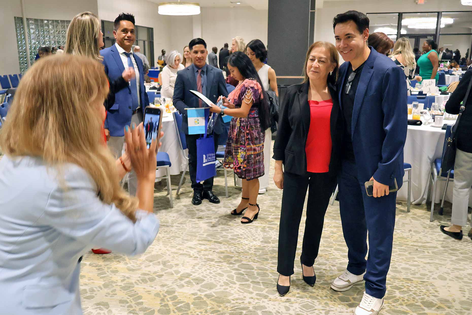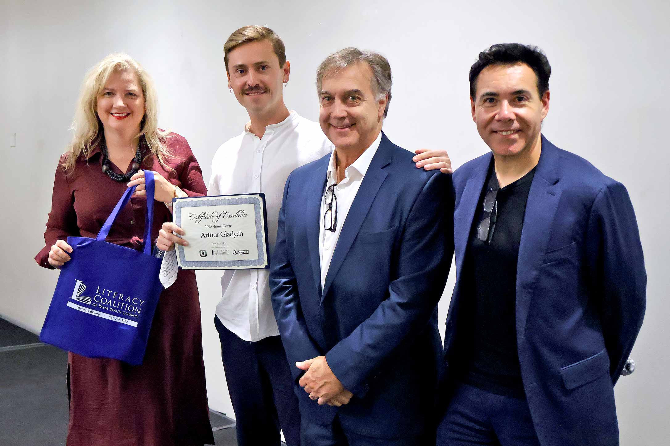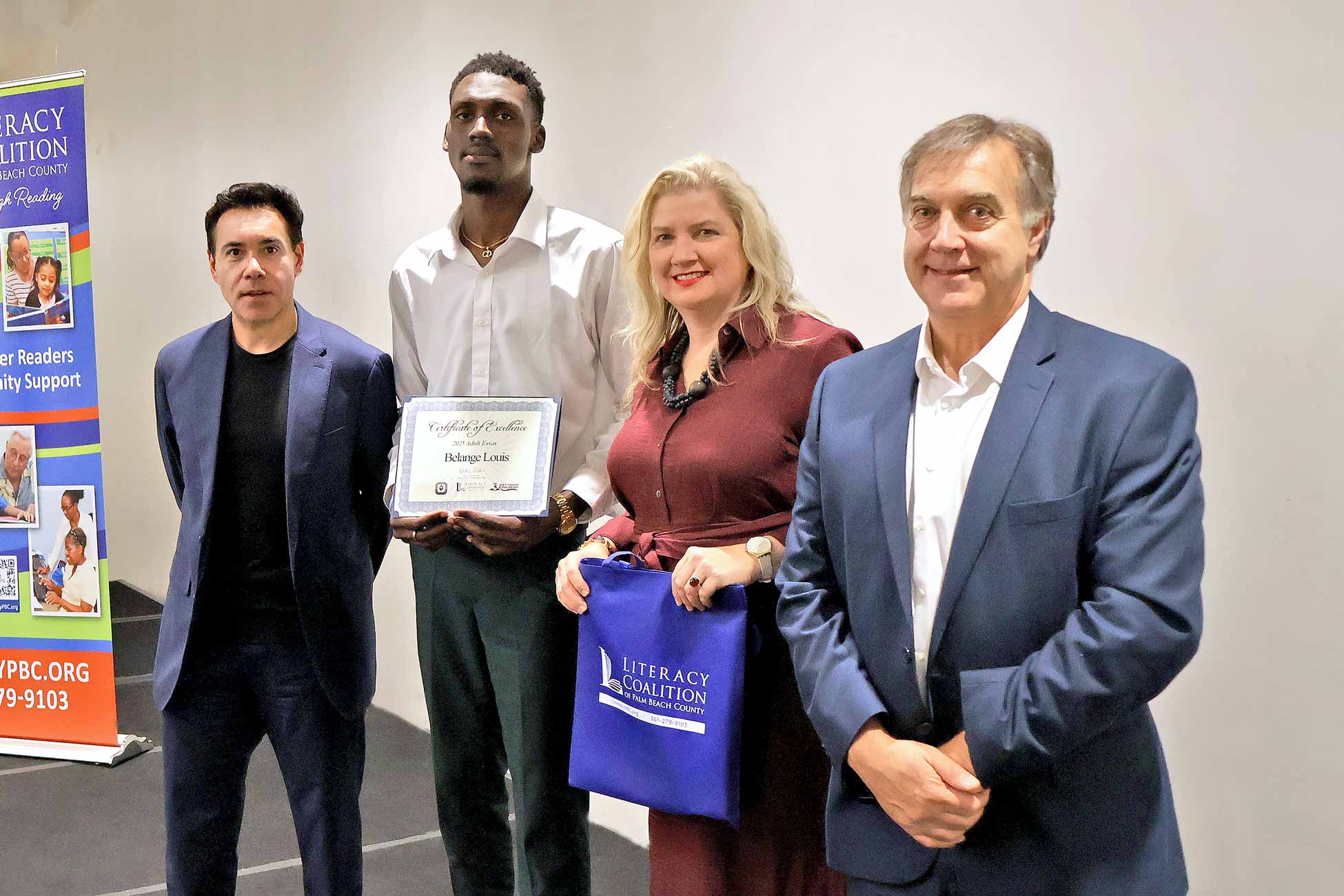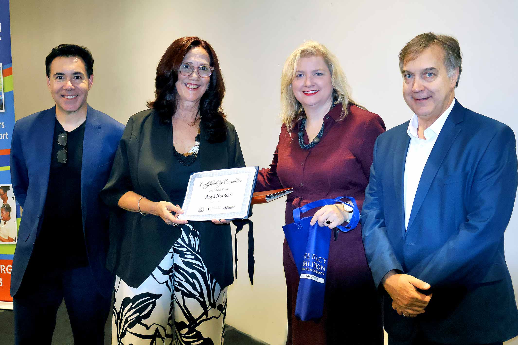 Adult Learner Asya Romero, Palm Beach Central Community High School. Shown with Carlos Mahecha, CBS 12 Sinclair Broadcasting Group, Literacy Coalition CEO Kristin Calder, and Fred Barch, Director School District of PBC, Department of Adult Education and Community Education.