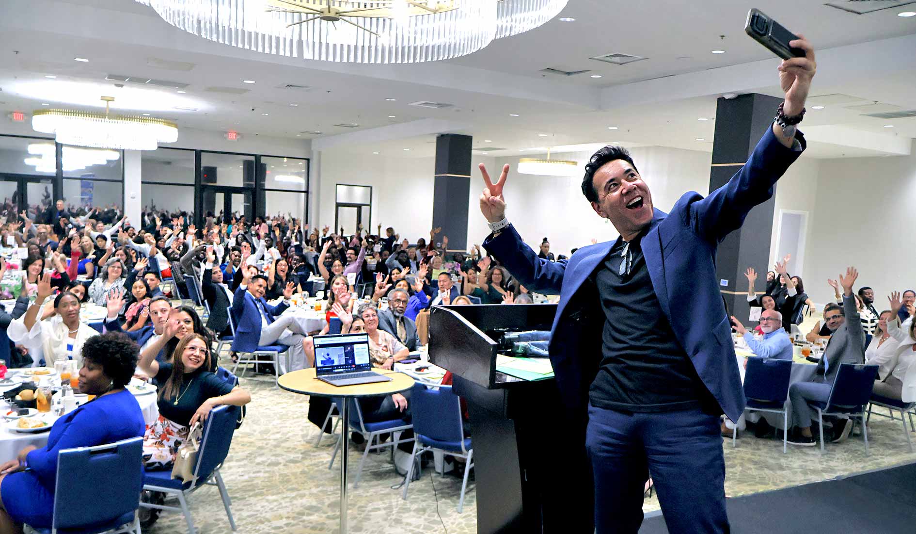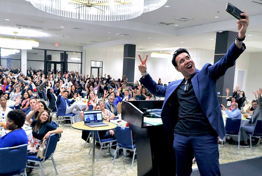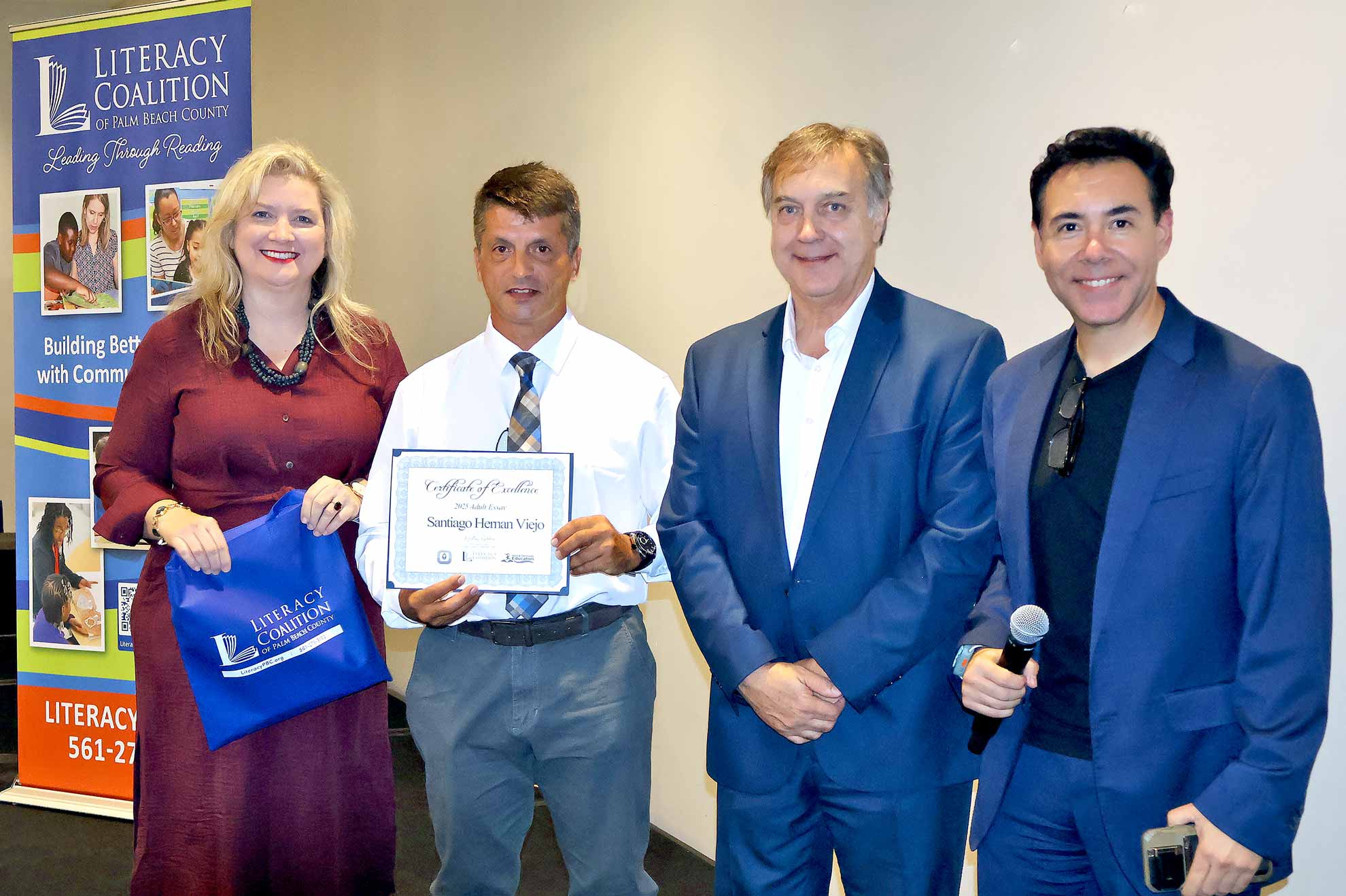 Adult Learner Santiago Hernan Viejo, Boynton Beach Community High School. Shown with Literacy Coalition CEO Kristin Calder, Fred Barch, Director School District of PBC, Department of Adult Education and Community Education, and Carlos Mahecha, CBS 12 Sinclair Broadcasting Group.