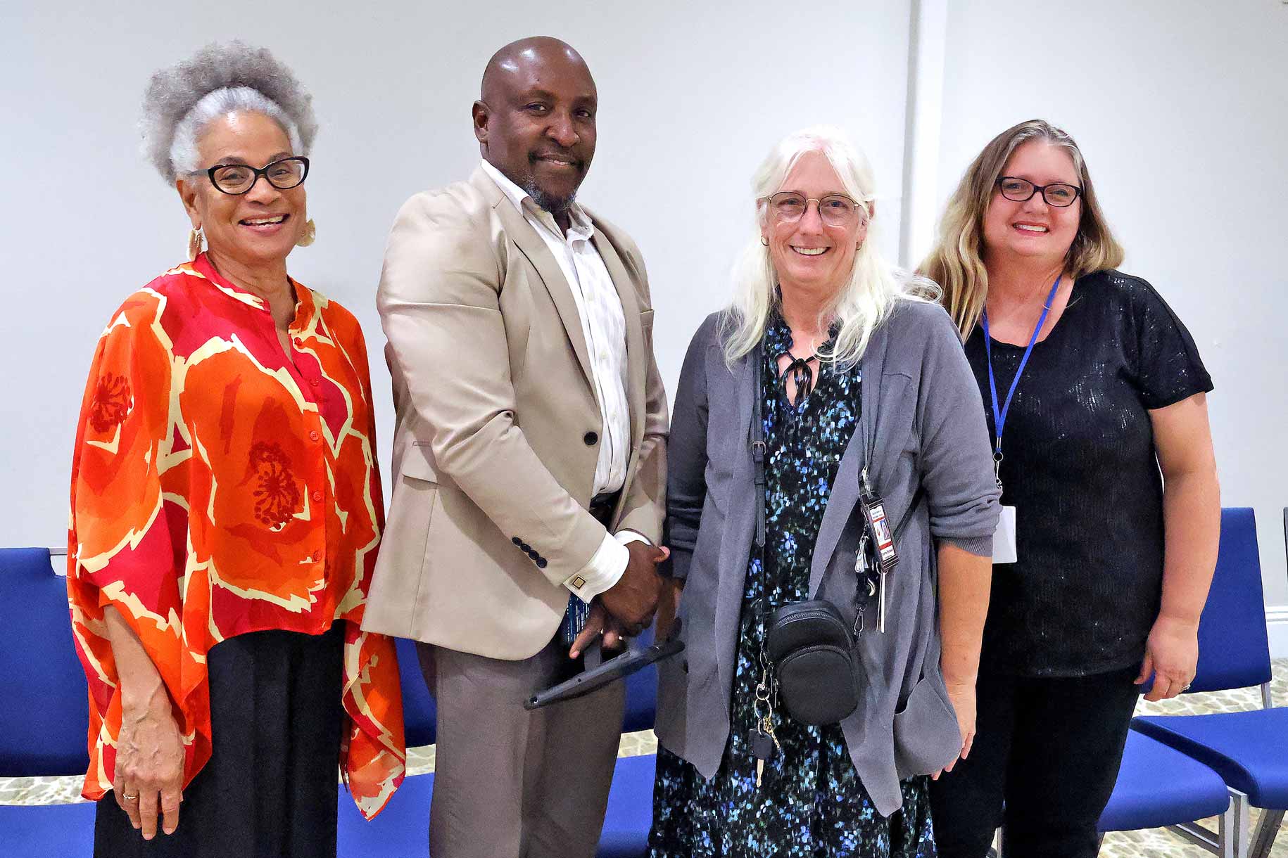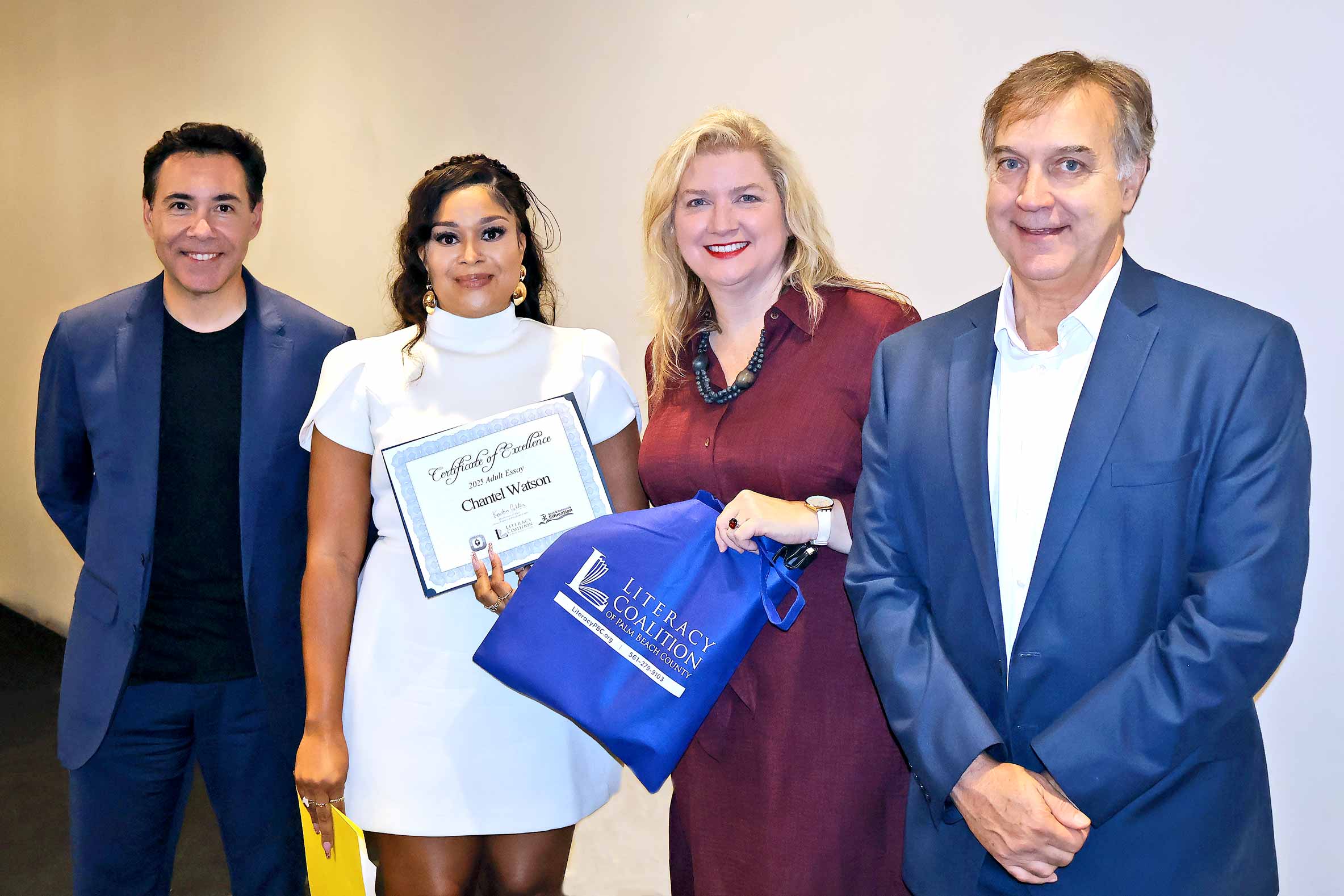 Adult Learner Chantel Watson, West Technical Education Center. Shown with Carlos Mahecha, CBS 12 Sinclair Broadcasting Group, Literacy Coalition CEO Kristin Calder, and Fred Barch, Director School District of PBC, Department of Adult Education and Community Education.