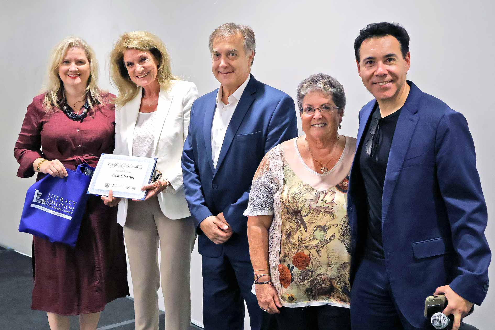 Adult Learner Ivete Chemin, Boca Raton Community High School. Shown with Literacy Coalition CEO Kristin Calder, Fred Barch, Director School District of PBC, Department of Adult Education and Community Education, her teacher and Carlos Mahecha, CBS 12 Sinclair Broadcasting Group.